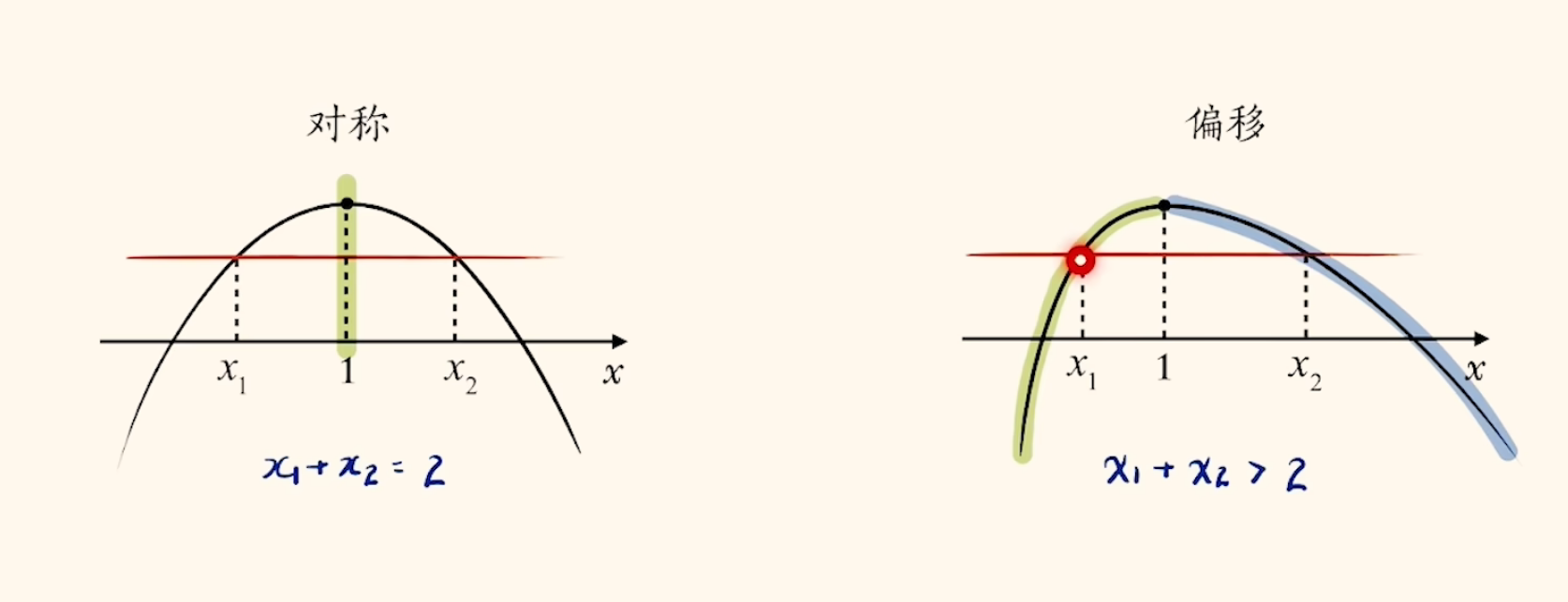 极值点偏移, 就是对于一个函数来说, 它并非完全对称(函数值相等的两个点\frac{x_1 + x_2}{2} = x_{mid} = x_极), 而是"长歪了"(符合\frac{x_1 + x_2}{2} = x_{mid} < x_极 或 \frac{x_1 + x_2}{2} = x_{mid} > x_极的函数). 题目一般会要求我们证明一个关于x_1 和 x_2(不一定对称)的不等式(不一定是相加, 但很多时候都要转换为x_1 + x_2).